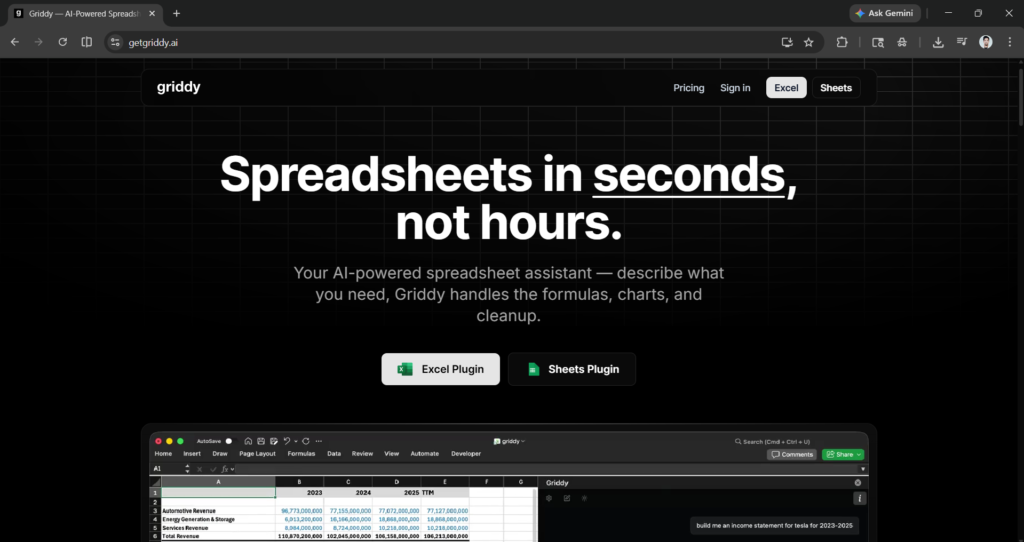 While power users are already finding ways to integrate generalized models like ChatGPT and Claude into their workflows, specialized plugins offer a more frictionless experience. Griddy AI is one of these specialized solutions, engineered to bridge the gap between complex data manipulation and plain English.